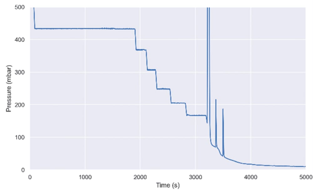 Due to the number and complexity of steps involved, solid loading is a prime candidate for increased automation. Thankfully, new features like AutoDest and AutoDry have automated one of these processes. The AutoDest function evaporates solvents automatically without the need to select a suitable system pressure. A sensor monitors the temperature of the inlet and outlet of cooling water to the condenser, and the vacuum pressure is adjusted accordingly. This frees up time for a lab technician like me as the process does not have to be monitored regularly. Nowadays, you can also add an AutoDry valve between the condenser and receiving flask. Whereas AutoDest reduces the evaporation solvent to a minimum, AutoDry evaporates the residual solvent to dryness quickly and without any interference from the user. The combination of these two additions to the traditional rotavapor setup results in the highest levels of automation for preparing samples for solid loading. The graph below shows the system pressure over the course of the automated distillation process.