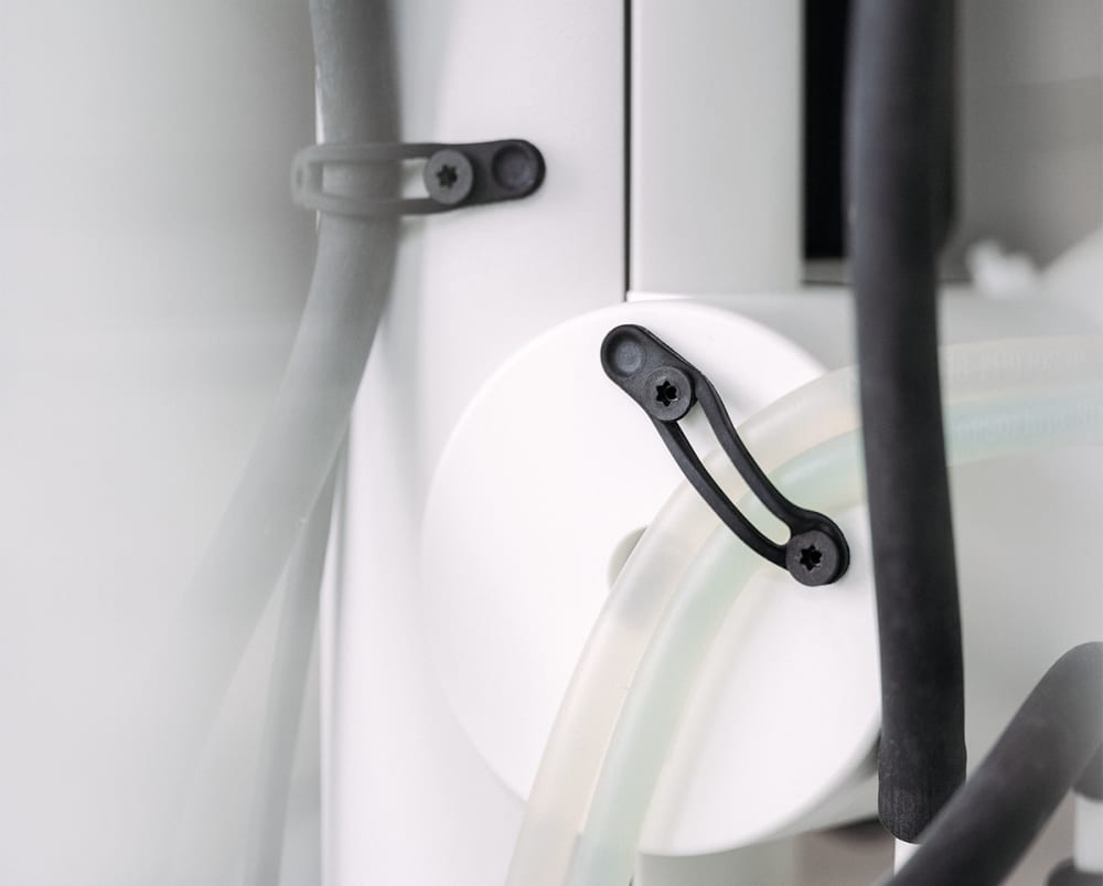 Dank Kabel- und Schlauchführungen können Sie Ihren Arbeitsplatz durch Fixieren prozessrelevanter Leitungen an der Rückseite des R-180 aufgeräumt und sicherer gestalten.