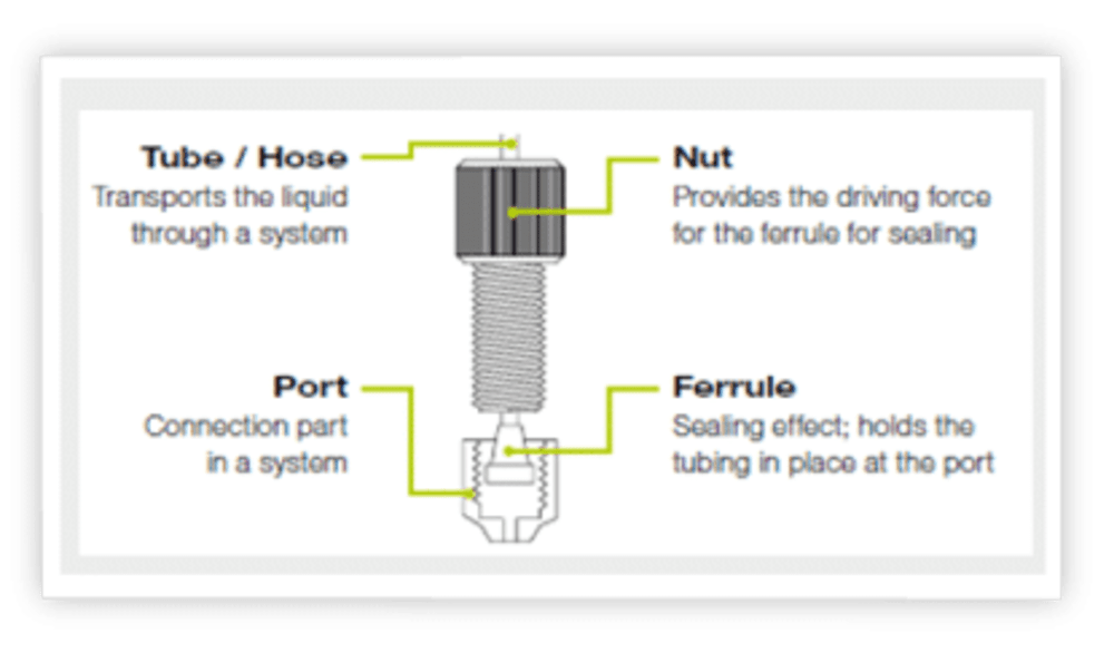Ports – Similarly to ferrules, these parts can be either flat bottomed or coned. Flat bottomed ports are better suited to low pressure applications, such as flash chromatography, whereas coned ports are suitable for prep HPLC.