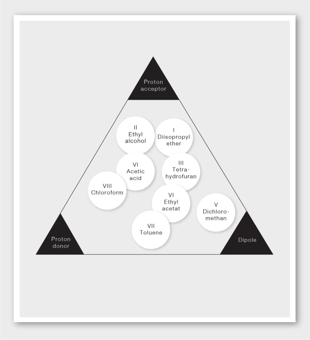 In general, every solvent has its own selective properties. L.R. Snyder and J.J. Kirkland investigated and compared various solvents and grouped those with similar effects together into selectivity groups. The selectivity groups are organized into a selectivity triangle that makes it possible to visually compare solvents.