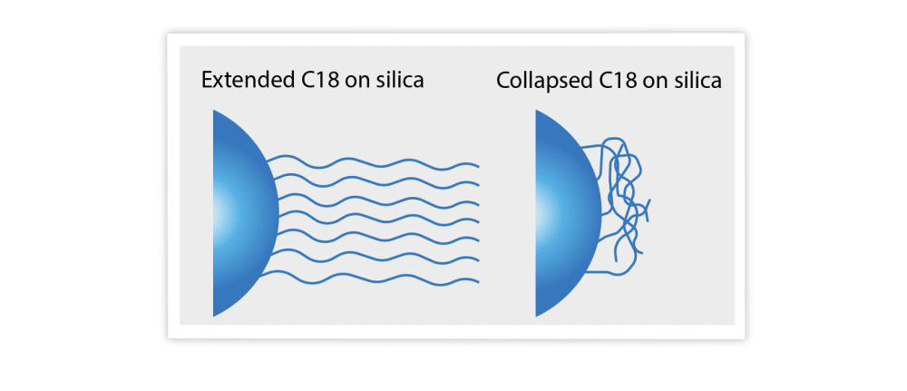 There is a danger to this tactic. When using traditional C18 phases in chromatography , the water content cannot be increased infinitely. This is because water content that is too high will have a negative effect on the material performance. Just like adding more and more potatoes to your plastic bag can damage the material to point of breakage, too much water in the mobile phase can overburden the packing material in your column. In fact, as soon as the water content measures 95% or higher, there is a real risk of phase collapse, as shown in the picture below.