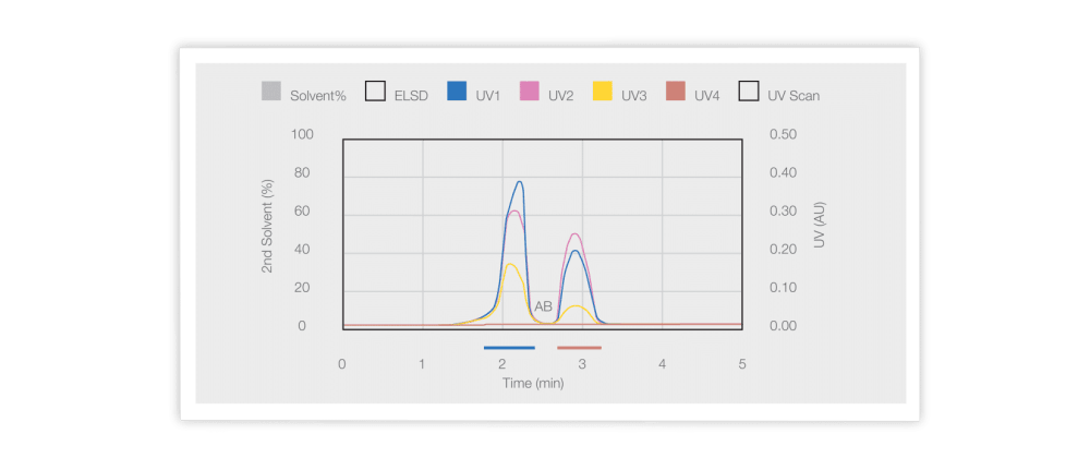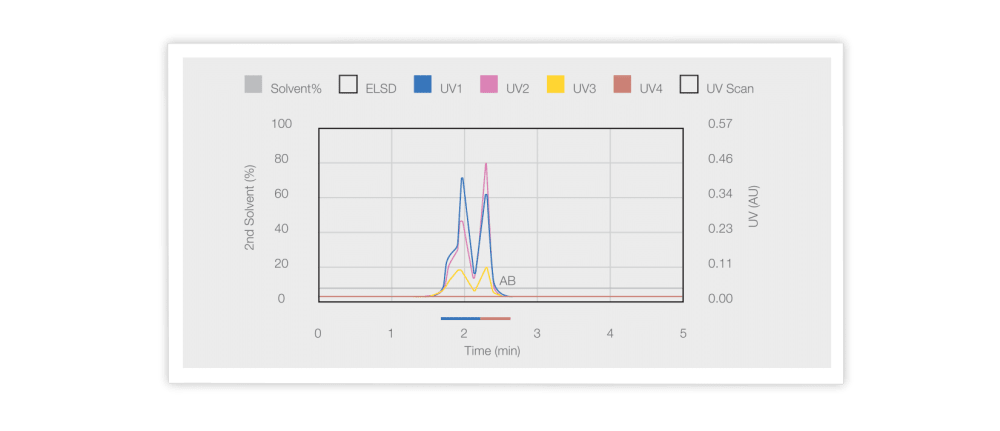 If I use a C18-AQ phase instead, I can use 100% water in the mobile phase. With this approach, I can obtain complete separation of the two polar vitamins (see graph below) with the chromatography system.