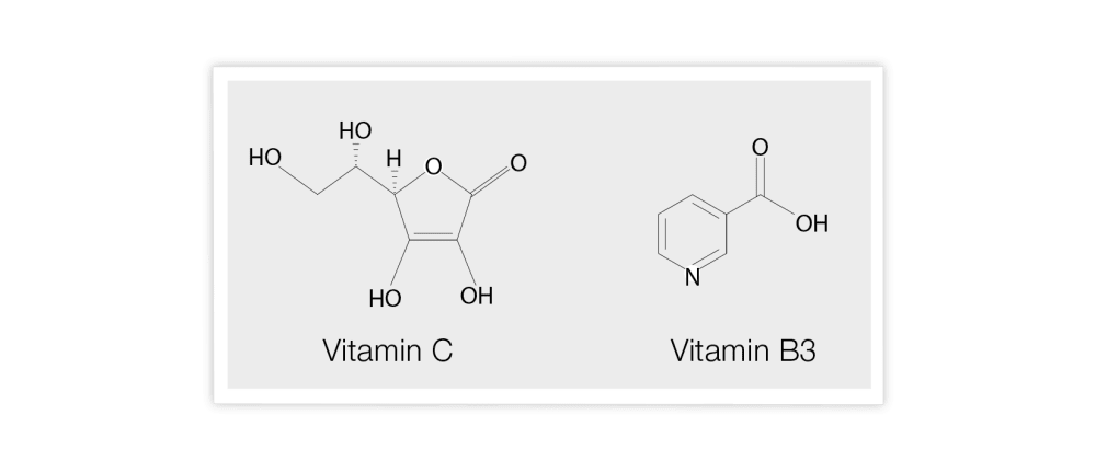 If I use traditional C18 columns, I can only use up to 95% water in the mobile phase, which is insufficient for obtaining a full separation of the compounds. In the graph below, you can see that separation of vitamin C and vitamin B3 on such a standard C18 column (95% water and 5% organic solvent in the mobile phase).
