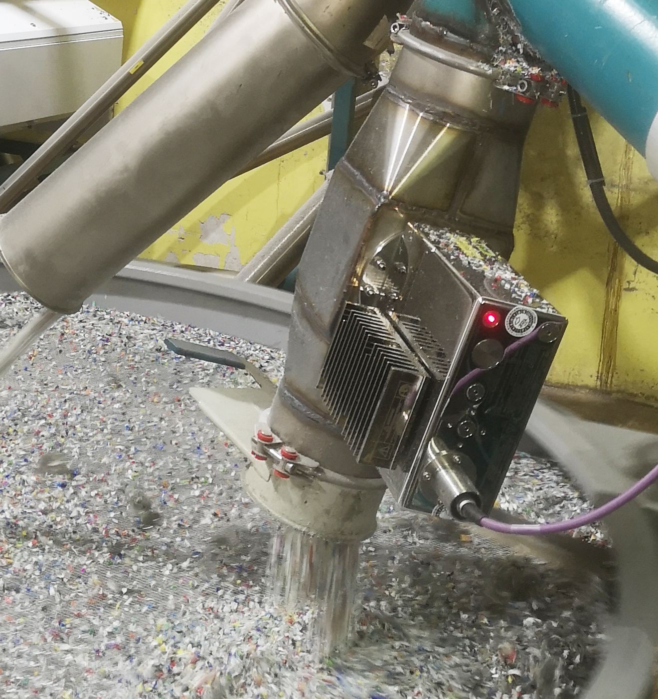 Gemessen werden Kunststoffflakes nachdem die Ausgangsmaterialien zunächst intensiv gewaschen, nach Sorten und Eigenschaften getrennt und zerkleinert worden sind. „An dieser Stelle in der Prozessführung ist es relevant, die Mischungsanteile zu kennen, um beim Compoundieren in Extrusionsanlagen gewünschte Zielwerte effizient zu erreichen“, so der Leiter des Kunststofflabors, Tobias Herzog. Er zeigt die Installationspunkte der NIR-Online Flakes-Messungen an einem der Vorlagebehälter (Abb.2).