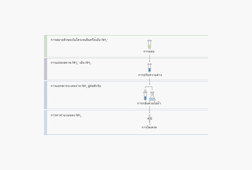 ส่วนที่สองของวิธีการนี้เกี่ยวข้องกับการกลั่นด้วยไอน้ำด้วยชุดกลั่นตัวอย่างที่เหมาะสม ค่า pH ของตะกอนที่ย่อยแล้วจะต้องเพิ่มให้สูงถึง 9.5 โดยการเติมโซเดียมไฮดรอกไซด์เข้มข้นในขั้นตอนการปรับความด่างนี้ จะเกิดก๊าซแอมโมเนียขึ้นที่ค่า pH จุดนี้ ปริมาณโซเดียมไฮดรอกไซด์จะถูกปรับให้เหมาะสมโดยอัตโนมัติด้วยเซ็นเซอร์ตรวจจับปฏิกิริยา ซึ่งช่วยประหยัดทรัพยากรและค่าใช้จ่าย จากนั้นก๊าซแอมโมเนียจะถูกส่งผ่านการกลั่นด้วยไอน้ำไปยังสารละลายดูดซับที่มีฤทธิ์เป็นกรด ได้แก่ กรดบอริกเจือจาง และแปลงเป็นแอมโมเนียม (ภาพที่ 3) เราสามารถกำหนดวิเคราะห์ความเข้มข้นของไนโตรเจนในสารละลายที่ได้โดยการใช้วิธีกำหนดวิเคราะห์ด้วยการวัดศักย์ไฟฟ้าของเซลล์ไฟฟ้าเคมีแบบดั้งเดิมหรือใช้แบบการวัดความเข้มของสีโดยขั้วไฟฟ้าก็ได้